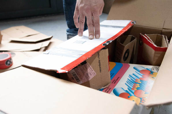 The ideal box for 80 records measures 32 x 32 x 40 centimetres. We recommend not exceeding any of these dimensions by more than a few centimetres, because otherwise the excess space in the box can’t be reliably filled so that it stays rigid during transport.